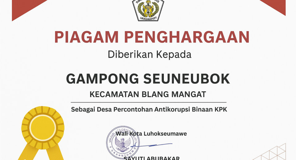 Lhokseumawe – Gampong Seuneubok, Kecamatan Blang Mangat, menerima Piagam Penghargaan sebagai Desa Percontohan Antikorupsi Binaan Komisi Pemberantasan Korupsi (KPK) . Penghargaan ini diberikan oleh Wali Kota Lhokseumawe, Sayuti Abubakar , sebagai bentuk apresiasi atas komitmen dan upaya Gampong Seuneubok dalam mewujudkan tata kelola pemerintahan gampong yang transparan, akuntabel, serta bebas dari praktik korupsi. Piagam dianugerahi […]